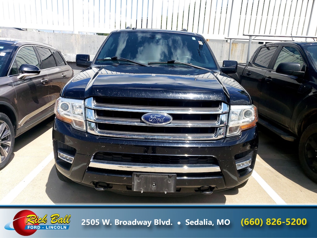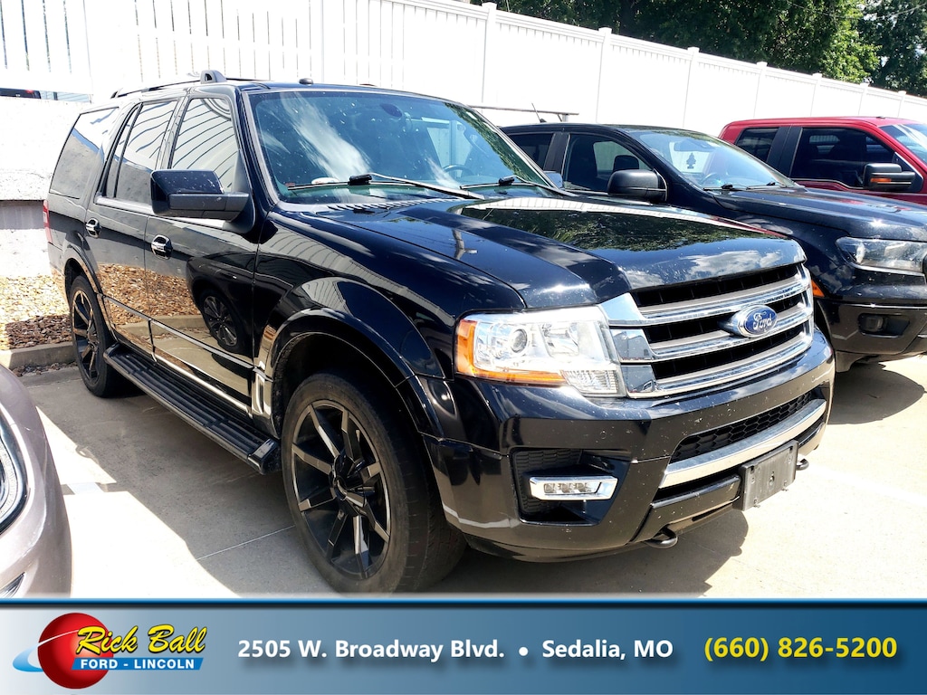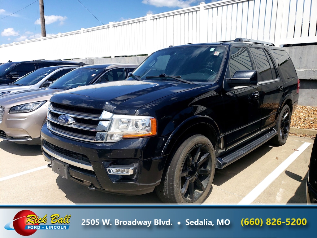 Come see this 2016 Ford Expedition Limited. Its Automatic transmission and Twin Turbo Regular Unleaded V-6 3.5 L/213 engine will keep you going. This Ford Expedition has the following options: SHADOW BLACK, POWER MOONROOF, Window Grid Antenna, Wheels: 20" Polished Aluminum, Trunk/Hatch Auto-Latch, Trip Computer, Transmission: 6-Speed Automatic w/SelectShift, Transmission w/Driver Selectable Mode and HD Oil Cooler, Trailer Wiring Harness, and Tires: P275/55R20 AT BSW. Stop by and visit us at Rick Ball Ford Lincoln Sedalia, 2505 West Broadway Boulevard, Sedalia, MO 65301.
